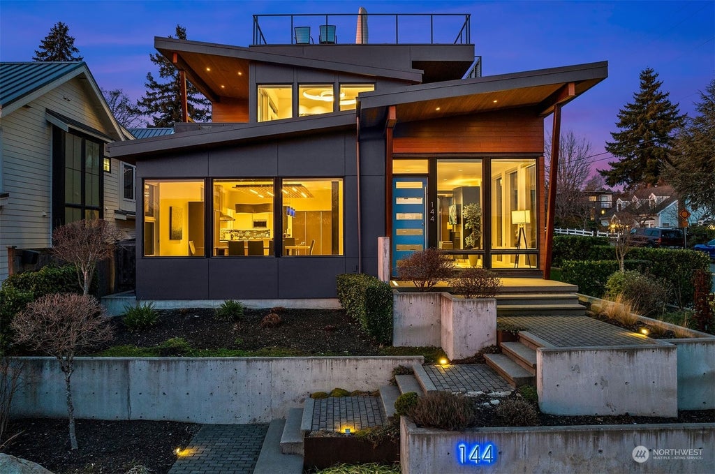 Spectacular custom home East of Market in Kirkland. Features concrete/steel construction, open living, and panoramic lake, mountain and city views from the rooftop deck. Main level kitchen with cork floor flows into the open living/dining area. Primary suite offers a spa-inspired bath experience with floor-to-ceiling natural stone, custom closet and hot tub on your private balcony. A 500-bottle backlit wine cellar, gym, home theater and 2 bed/with full bath grace the lower level. 2-car garage w/14’ high ceilings plumbed to accommodate two 4 post car lifts, central vac, air compression and wired for EV. Outdoor heated covered seating with BBQ area. Fenced dog run & matching storage shed. This extraordinary residence epitomizes modern living.