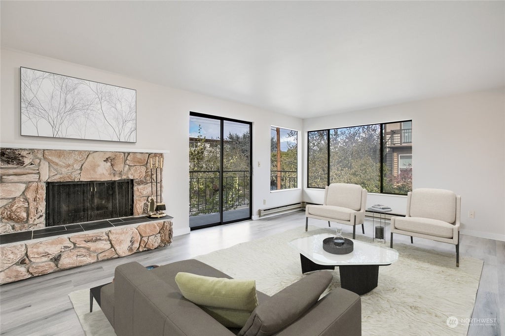 Beautifully refreshed Ballard condo! This light and bright condo features an updated kitchen, bathroom, flooring, paint, and more! Enjoy summer nights on the balcony with views of the Olympics and surrounding areas, and rainy days cozied up to the wood burning fireplace. Large living space allows for plenty of furniture and/or work areas. The efficient kitchen includes all appliances, even a washer and dryer. Lots of storage throughout, as well! Building boasts lobby entrance, an elevator, large storage unit, and deeded garage spot. Small condo community with no rental cap and no special assessment! Move right in and start enjoying everything Ballard has to offer!