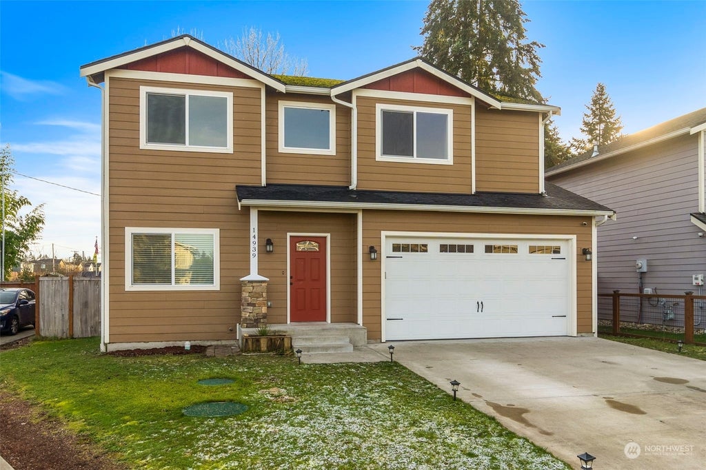Beautiful 4-bedroom, 2.5-bath home located in Yelm's sought-after Bella Housa neighborhood. You'll be greeted by attractive laminate floors throughout the main level, a cook's kitchen featuring granite counters, SS appliances, gas cooktop stove, dining area, a spacious pantry & large laundry room. The primary suite includes a roomy 5-piece en-suite bathroom & a generous walk-in closet. Tile flooring elevates the bathrooms & air conditioning ensures year-round comfort. Outside, enjoy a fully fenced yard & a 2-car attached garage. The neighborhood offers a modern clubhouse w/workout room, kitchen & event space. Close to schools, downtown & a convenient commute to JBLM. A 2.375% interest rate VA assumption is available to eligible VA buyers.