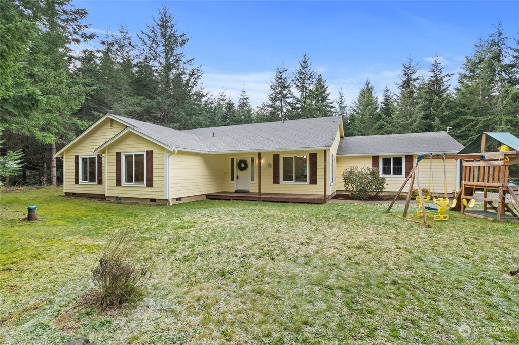 Discover this private 4 bedroom, 2.5-bath home on 5 acres of serene land. With 2320 sq ft of living space, this home features a spacious, open floor plan with vaulted ceilings, skylights, and custom wood accents throughout. The updated kitchen includes an eating bar, new propane range, modern cabinetry, and ample storage, flowing into the inviting great room. The private primary suite offers French doors, a large walk-in closet, and a 5-piece ensuite. Additional bedrooms are tucked away in a separate hall. Enjoy outdoor living with a covered front porch and back deck. A tranquil retreat you won’t want to miss!
