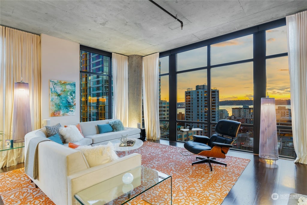 Floor-to-ceiling windows in this stunning contemporary corner unit offer breathtaking views of the Olympic Mountains, Puget Sound, city skyrises, & incredible sunrises/sunsets. The inviting entry leads to a guest bath, versatile office/den/sleeping area followed by kitchen, dining, & living spaces that are open-concept yet distinct, ideal for entertaining. The bedroom suite features a private teak deck & custom walk-in closet. Your new home includes Lutron automated shades and lighting, on-site storage, a premium parking spot with EV charging, a rooftop retreat with harvestable garden & center-stage view of the Space Needle. Steps from Seattle Center, SAM Sculpture Park, & Pocket Beach. Enjoy easy access to Uptown, SLU, Pike Place, & more!