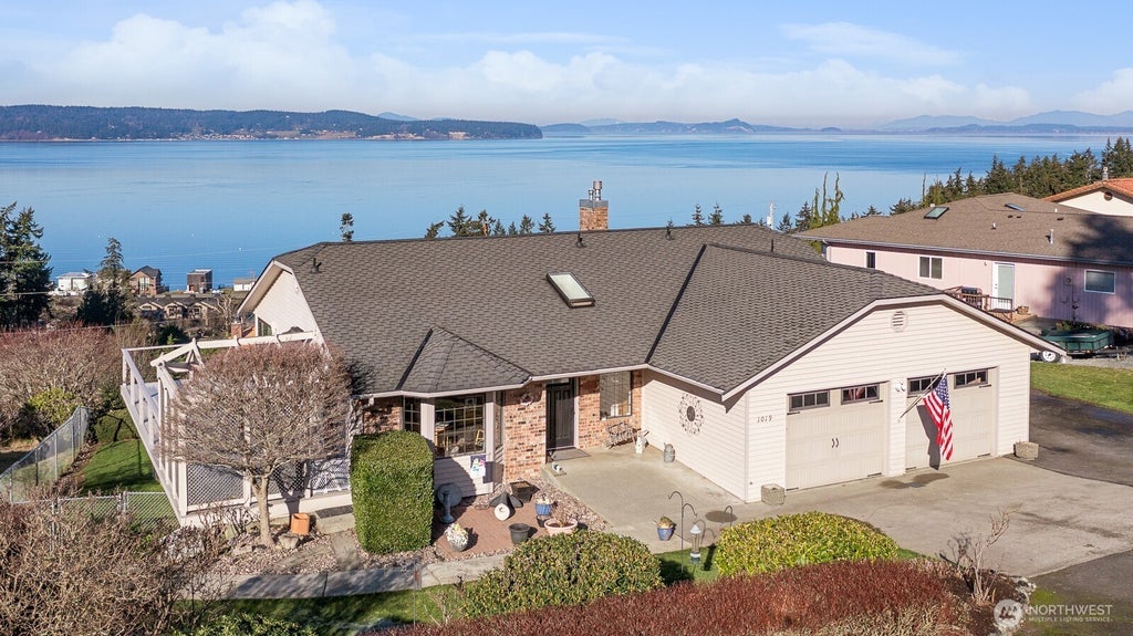Immaculate home w/views of Whidbey, Mts. & Utsalady Bay! Fantastic N. end location on a private lane. 2845sf w/4 beds, 2.75 baths on .44 acre lot. Level entry w/skylight leads into open floor plan w/views from every room. Large open kitchen w/breakfast nook w/slider to deck. Dining rm off kitchen w/slider. Living rm w/brick FP, vault. ceilings & large windows for natural light. Upper bed makes a great office & 3/4 guest bath. Lg utility rm w/sink. Lower level; beautiful primary suite w/5 piece bath, WI closet, sitting area, & door to patio. Family rm w/gas stove & 2 add. bedrms & full bath. Beautiful landscaping & deck perfect for entertaining. Oversized 2 car garage, generator, & plenty of parking, room for RV & nearby beach rights. Hurry!