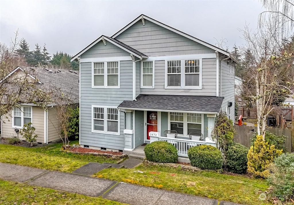 Palisade Village home in highly sought after NW Landing. A Centex built home with most popular floor plan featuring engineered hardwoods on main floor. Features include newer 2020 roof, Hardi plank siding, vaulted ceilings, skylights, ceiling fans, and adjoining open living room and dining room. Family room w/gas fireplace adjoins to sun-filled kitchen and granite counter tops, nook & entertaining space galore. Upper level to a large primary suite w/large walk-in closet, 5 piece bath, and jetted tub. Custom blinds, gas water heater, and HVAC with A/C. Landscape features cobblestone pathway, deck, lawn area + fully fenced backyard. Wonderful front covered porch, close to schools and close to schools, shopping, and JBLM. Welcome home!