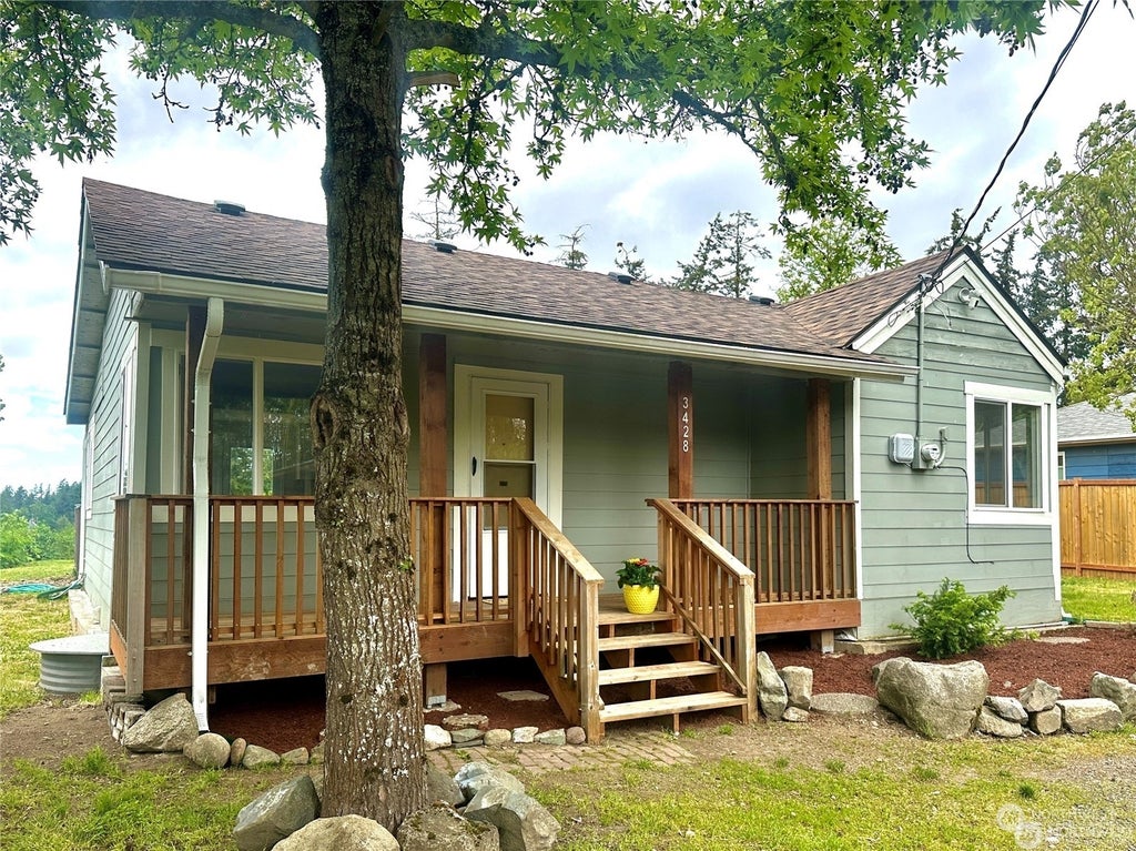 Welcome home! Watch beautiful sunsets from your home and porch every evening with views of large green backyard and neighboring pasture. Adorable turnkey home with well-designed layout. Open concept living space and kitchen w/dining bar for easy entertaining. New Roof in 2024! Two bedrooms and one 3/4 bath. Granite countertops, LVP floors, tile in bathroom and shower surround. Energy efficient convection heating throughout home. Central laundry closet w/stacked W/D. Cute 10x12 shed for storage, work space, gardening. Large level lot, great sunsets with back deck and yard facing west, front of home faces east. Easy commute to 512, hwy 18, and I5. Don't miss this one!