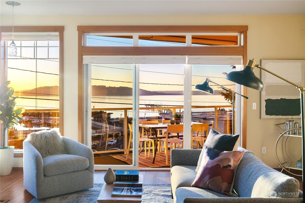 Showstopping views of Puget Sound take center stage in this 1-owner unit at The Cliffs! Set above the Des Moines Marina & blocks from shops & cafes, this is your chance to live the luxe beachy life in this coveted boutique building. Soaring ceilings & large windows fill every space w/ light & panoramic views. Open concept layout w/ gorgeous bamboo floors, a gas fireplace, stylish top-down/bottom-up blinds, a flex home office, a private deck to take in the views, & a large kitchen w/ granite counters, stainless appliances & wine fridge. 2 large bdrms incl primary w/ elegant spa bath & custom walk-in closet. Efficient updates incl. in-floor heat & a tankless water heater! Well-run HOA w/ gym, lounge, garage parking & secure entry. A must-see!