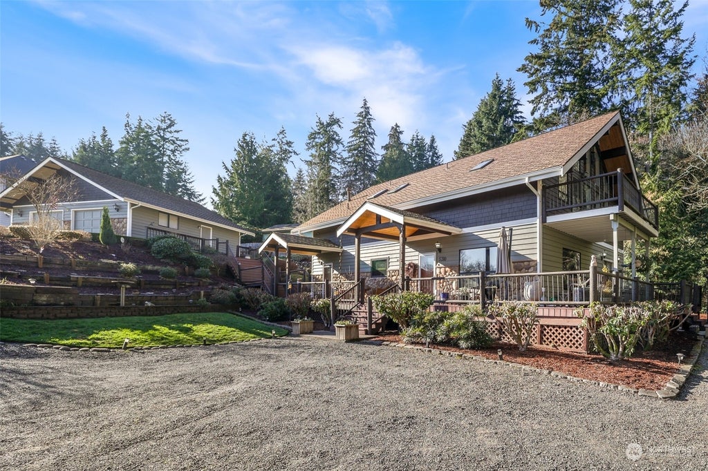 Natural beauty surrounds this absolutely gorgeous, unique home! Huge windows in living space bring in the serene setting full of greenery! At the top of the property, enjoy views of mountain and sound! Absolutely incredible, tranquil retreat in beautiful Illahee, yet still so close to everything! This home boasts amazing upgrades in recent years. Top of the line kitchen with quartz counter tops and high-end appliances! Central air and gas furnace as well as generator all since 2017. Primary bathroom completely remodeled with heated floors! Large garage insulated. Amazing deck that wraps around to enjoy all the outdoors! Decking leads to gazebo area for relaxing and upper lot area to enjoy the views! Front porch remodeled with luxury cover!