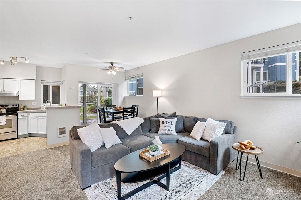 Inviting ground floor home in desirable Cambria Hills. This unit features an open concept layout with soaring 9-foot ceilings. The well-appointed kitchen showcases stainless steel appliances and ample counter space. Warm and welcoming living room with a cozy wood burning fireplace. Generous primary bedroom boasts a walk-in closet and full bathroom. In-unit laundry. Private covered patio perfect for outdoor living. Enjoy community amenities including pool, hot tub, fitness center and clubhouse. Assigned parking spot steps from your front door. Ideally situated with easy access to I-405, shopping, dining and all that Bothell has to offer. Pet-friendly community with no rental cap makes this perfect for both owner-occupants and investors.