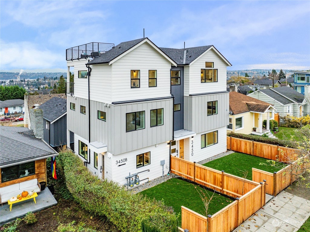 Nestled in the sought-after Belvidere neighborhood, this stunning new construction offers a blend of modern design and breathtaking views. Boasting 3 bedrooms, 2.25 baths, and 1,000 sqft of stylish living space, this home is built for comfort and convenience. Enjoy sweeping panoramic views from the expansive rooftop deck, featuring vistas from Mount Rainier to Downtown Seattle's skyline and the Cascade Mountains. The spacious primary suite includes a walk-in closet and a beautifully designed ¾ bath. With a 348 sqft attached garage, mini-split heat and AC, and a fully fenced yard, this home provides the perfect urban retreat, close to the Alaska and Admiral Junctions.