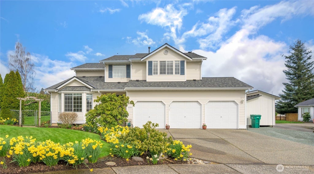 Nestled on a spacious lot backed by a lush greenbelt, this well-maintained home welcomes you with vibrant flower beds and classic curb appeal. Inside, you'll find generously sized rooms on both the main and upper levels, filled with natural light. The kitchen and family room flow seamlessly to a large deck overlooking a peaceful, fully fenced backyard with mature fruit trees. Recent updates include a newer roof, furnace, and water heater. The expansive primary suite offers views of Fidalgo Bay. Additional highlights include a heated 3-car garage with built-ins, RV/boat parking, a formal mud room, and a custom shed. All just a short stroll to local schools, the community pool, scenic hiking trails, and more!
