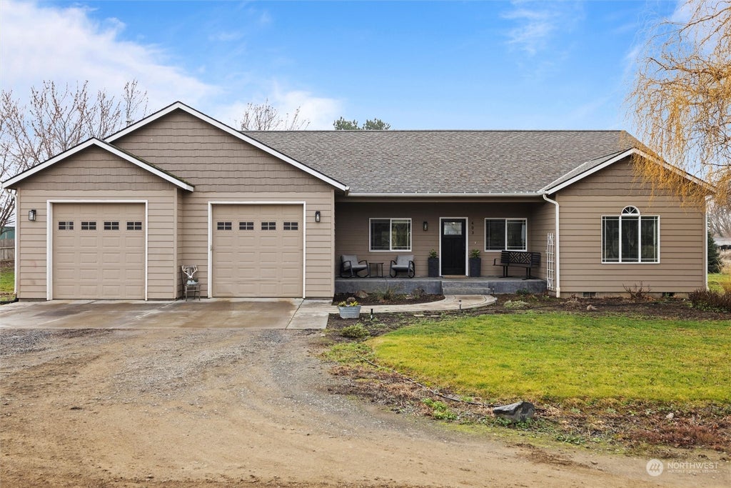 This charming single-level home offers 3 spacious bedrooms, 2.5 bathrooms, an office & 2 car attached garage. The large primary suite has a walk-in closet, slider to patio, soaker tub & step-in shower. The other 2 bedrooms & a full bathroom are located on the other side of the home for privacy. The open kitchen features lovely dark cabinets & quartz countertops offering style & functionality. Situated on a generous 1+ acre lot, this property offers plenty of space for outdoor activities & privacy. A massive 1,700+ square foot pole building w/ roll up doors on both sides, provides ample storage or workshop potential. With RV parking & water rights included, this property combines convenience, modern amenities, and room to grow. Welcome home!