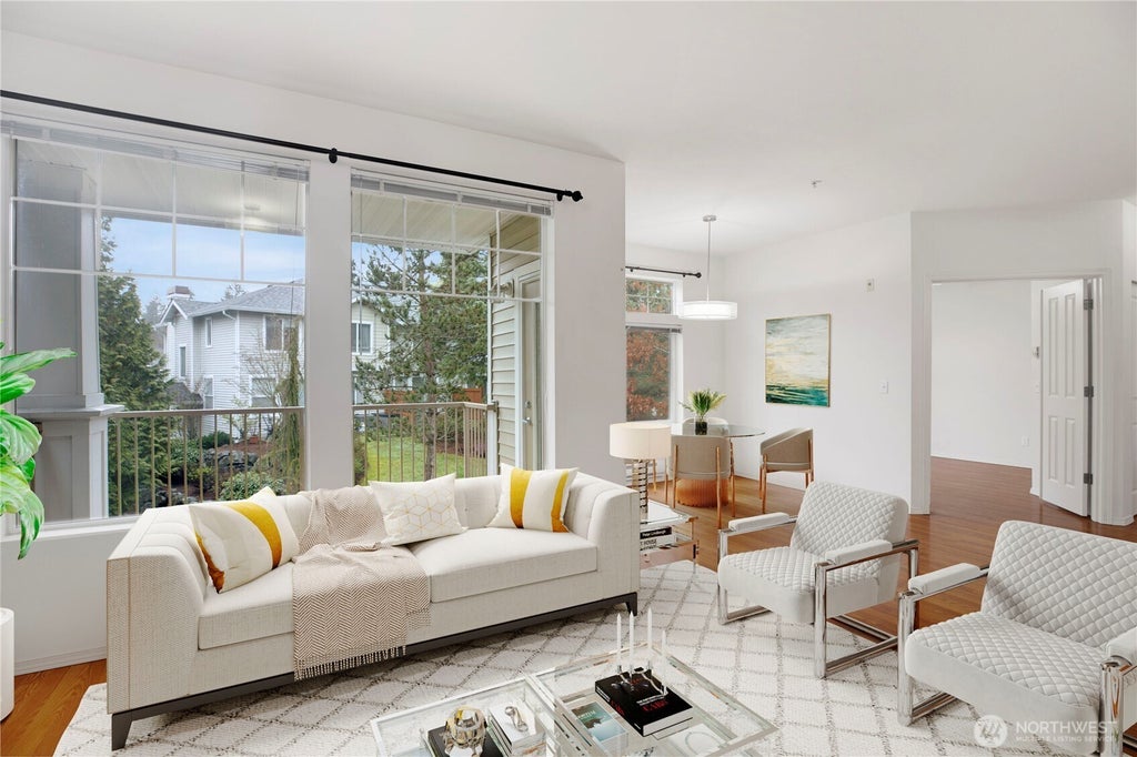 This charming two-bedroom, two-bathroom end unit condo at The Ridge at Highlands East offers a welcoming atmosphere with open living spaces, high ceilings, and ample natural light. The kitchen provides generous counter and cabinet space, while the cozy living room features an electric fireplace and opens to a private deck. The primary suite boasts an en-suite bathroom complete with a double vanity, soaking tub, and walk-in closet. Additional conveniences include in-unit laundry, an attached garage, and driveway parking. This pet-friendly community includes beautifully landscaped grounds, parks, a sports court, a gazebo, and walking trails leading to Willis Tucker Park. It is conveniently located near shopping and dining options.