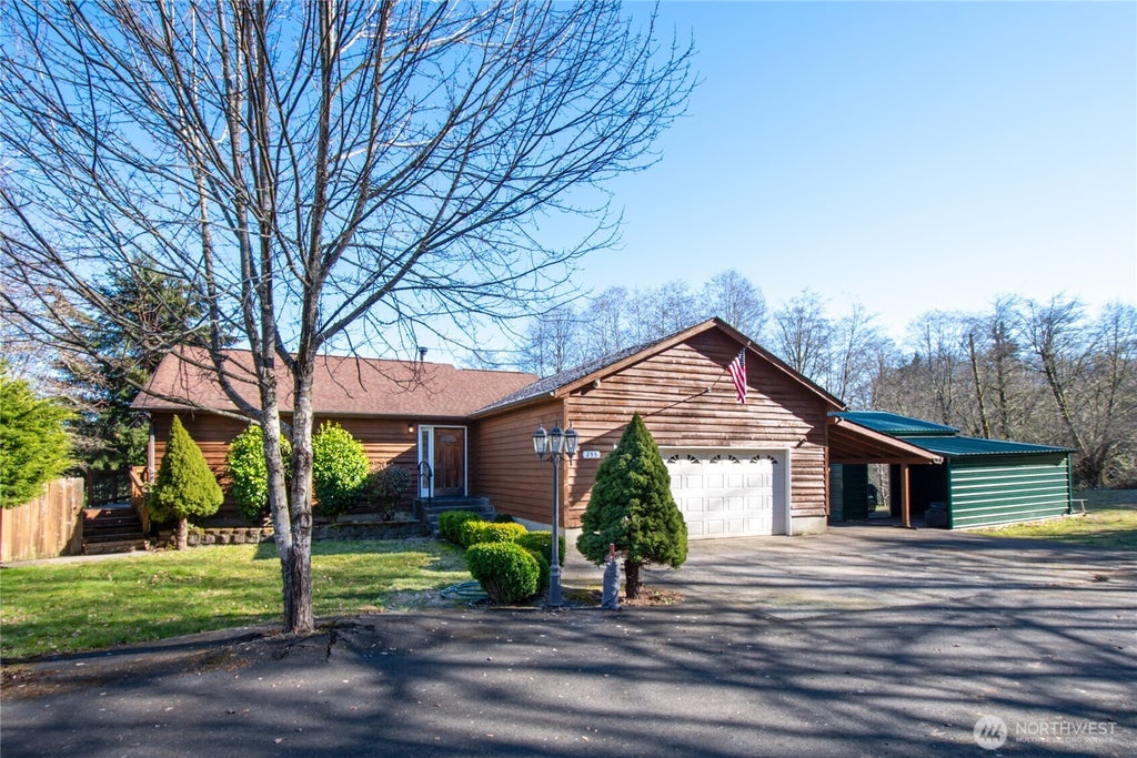 Luxurious NW Contemporary home on 5 acres with spectacular lake and territorial views. Exquisite home boasting 2256 SF, 3 bdrms, 3 bthrms, open concept living w/vaulted ceilings, living rm w/wood FP-2 FR Doors to viewing deck, dining rm area w/slider to deck, gourmet kitchen w/quartz countertops-tile back splash-tile floor-double ovens-SS appliances, den/office, spacious laundry rm, family rm w/FR doors to covered patio, primary bdrm w/slider to covered patio-ensuite w/dbl sinks-travertine tile floor-jetted tub, 2 car attached garage & carport, newer heat pump and 30 year architectural roof. The grounds feature flower gardens-ornamental plants-ample parking on asphalt driveways-3 bay carport for boat & RV storage-2 bay carport & shops!