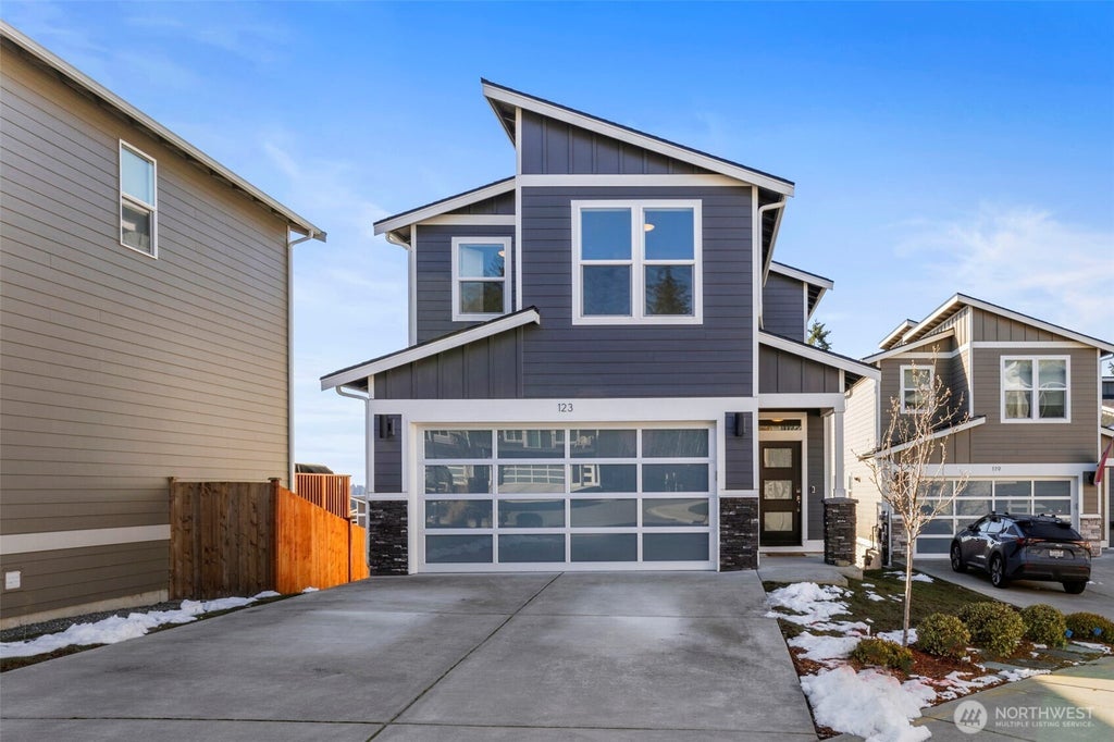 Spectacular like-new 3-bed, 3.25-bath home with water and Olympic mountain views! Open concept main floor living with chef kitchen, solid quartz counters and a large island opens to family room w/gas fireplace and built-in bookshelves. Upstairs boasts a large primary suite w/soaking tub, separate shower, large closet and private deck. 2nd bedroom, full bath & laundry upstairs. Downstairs you'll find a fully finished basement with 3rd bedroom, 3/4 bath, additional living room that opens to a patio & fully fenced backyard. Perfect for multigenerational living! So many upgrades in this home: A/C, water softener system w/ whole house filtration, plantation shutters. Convenient location close to Ferry, PSNS & Silverdale.