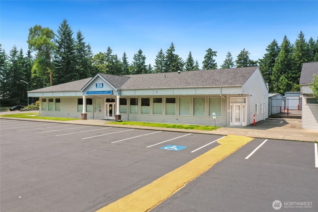 This building is located just off of a major artery in Silverdale, about one mile from a new $500 million hospital, yet it is partially screened by beautiful fir trees. It has the benefit of being very close to areas of commerce, with thousands of people passing by the office every day, yet it is not congested or in grid lock. This building has a two year old roof with a transferrable warranty, and 4 Carrier HVAC units that were replaced in 2018. Soundproofing throughout this building, using RC channel double walls, solid core cherry finished doors with sound sweeps, 14 comfortable offices, and a very functional support staff area with 5 workstations, capable of supporting a very sizeable business. Occupancy available on August 1, 2025.
