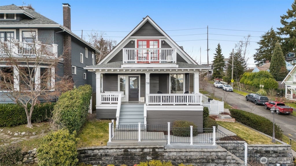 Stunning Victorian perched on a sunny 6300+ sq ft south facing corner lot with breathtaking city skyline, Space Needle fireworks, and Mt. Rainier views. Enjoy summer evenings on the charming front porch or entertain in the expansive, level backyard, perfect for play and pets. Inside, a gorgeous primary suite boasts French doors and a balcony, while a fabulous newer kitchen with an island breakfast bar and newer baths elevate the home. MIL apartment below, updated systems, fresh paint, carpet and ample off-street parking complete this gem. Unbeatable location, close to everything!
