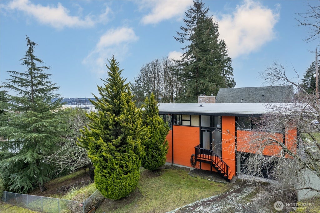 This mid century modern home inspired by architect Frank Loyd Wright, blends comfort & natural beauty. It sits on a fenced double lot w/ mature trees, Japanese maple, Rainier cherry tree, flagstone patio & multiple outdoor areas for entertaining, gardening or relaxing. Inside, the spacious living area features original hardwood floors & picture windows that capture 180 degree territorial & puget sound views. Cozy up by the wood stove or enjoy meals in the bright dining area w/ scenic vistas. You'll find 3 large bedrooms, including a primary suite on the lower floor w/ its own private living room & direct access to the balcony & yard. The oversized one-car garage offers ample storage. This has been a successful Airbnb. Close to PSNS & Hwy