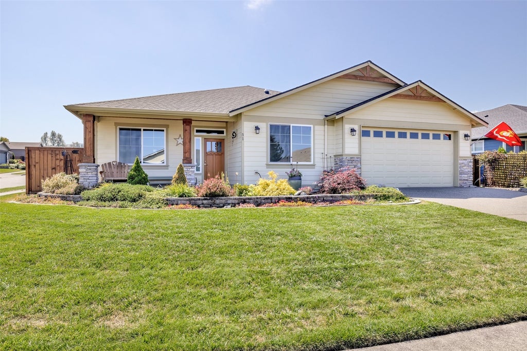 Zero Step Entry-Exquisite custom home of the highest quality in the Olympic Crest neighborhood in Sequim. Enter through a beautiful covered front porch w/ stained wood posts & ceiling. Open concept layout with a den/office & 2nd BR on one end & the spacious primary BR tucked away on the other end for maximum privacy. Superb quality throughout with granite counters in kitchen and bathrooms, hardwood floors, custom cabinetry, SS appliances & gorgeous finishes. Stone propane f/p in great room open to the stunning kitchen which includes a large island and ample room to create. Primary BR is large and the accompanying bath is straight out of a magazine with custom tile shower and granite counters. 3 sola tubes, brushed nickel throughout.