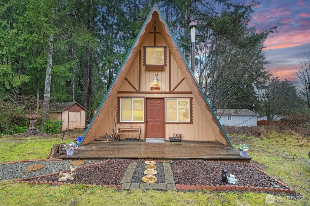 Adorable "A" frame in the Fawn Lake Community. Main floor includes the living room, kitchen, eating area and a bathroom. Spiral stairs to the primary bedroom with a balcony. Wood stove and 1 wall heater. Enjoy the gated community and all that it has to offer with tennis/basketball courts, swimming, fishing, parks, a cabana and is a non motorized boat lake community.