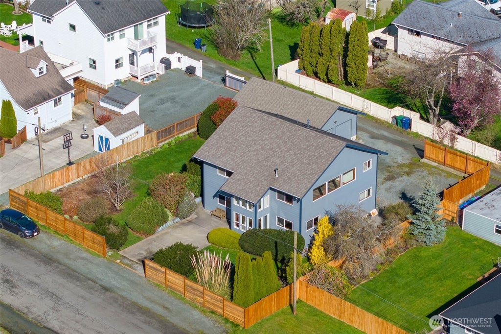 Centrally located in Anacortes and surrounded by mature landscaping, this home offers stunning views of Fidalgo Bay and Mt. Baker from a 9,000+ sqft lot. The 3bd/2ba main home features vaulted ceilings and abundant natural light creating an open and inviting atmosphere. Additional amenities include an expansive primary suite, updated kitchen and baths, granite countertops and poplar millwork throughout, ceramic tile and LVP flooring, radiant heat in select areas, a tankless water heater, and Hardie siding. A fully finished studio ADU with a private entrance and in-unit laundry adds flexibility for guests or rental income, all with ample parking. The detached garage includes power, water, and approved permits for a second ADU conversion.