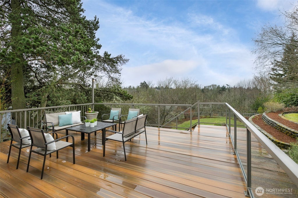 Adjacent to Carkeek Park, this Broadview gem offers breathtaking views of the Olympic mountains, sunsets, forest, and wildlife. This thoughtfully designed, open floor plan home features three spacious bedrooms, a versatile bonus room, an airy sunken great room with vaulted pine ceilings, a gas fireplace, and expansive windows. The kitchen boasts quartz counters, stainless steel appliances, and a breakfast bar. The primary suite offers an en suite bath with an infrared sauna. The lush backyard includes fruit trees, garden space, and large deck with a gas line for easy BBQing. With a detached garage, solar panels, and a prime location two blocks from the new Viewlands school, transit, and shopping, this home is move-in-ready. Pre-inspected!