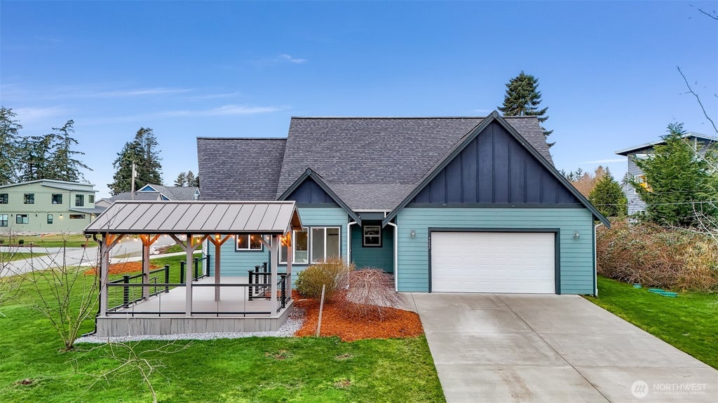 Sunny Drayton Harbor, Semiahmoo & White Rock views from like-new custom home. Modern A-frame design creates wall of windows facing westerly views, bright open spaces & tall ceilings. Primary bedroom & living spaces on main level. 2nd large bedroom + bonus room with views on upper level (home office? guest bedroom?). Soak in spectacular sunsets over the harbor in tranquil setting from newly constructed covered front deck. Walk across the street to community beach: paddle with blue herons & eagles perched on Drayton Harbor sea rock. Quiet, neighborly gem of a community, where homes rarely come on the market. Convenient access to I-5, short drive to both Bellingham & Canadian border. Large attached garage. Heat pump + propane fireplace.