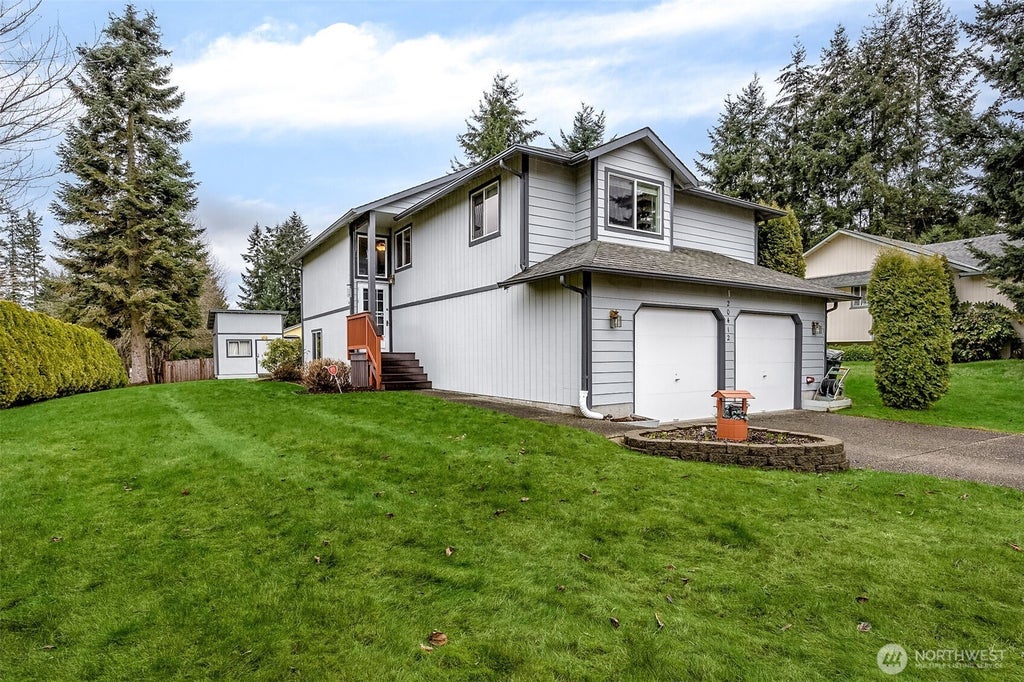 Stunning corner lot home in the Bonney Lake community of the Highlands w/partial Mt. Rainier views! Freshly painted inside & out, this spacious home features a bright living room with a cozy wood fireplace, a formal dining room with French doors to a private Trex deck, and a lower-level family room with built-ins. The kitchen includes an eat-in area, pantry & all appliances stay. Primary bedroom with ceiling fan, full bathroom, 2 guest bedrooms plus extra finished room & office/den—potential for 2 more bedrooms! Fully wired for a generator, plus a shed with loft storage. Backyard with fruit trees and garden beds perfect for gardening. Enjoy the community amenities: park, playground & sport court. A must-see home in a fantastic location!