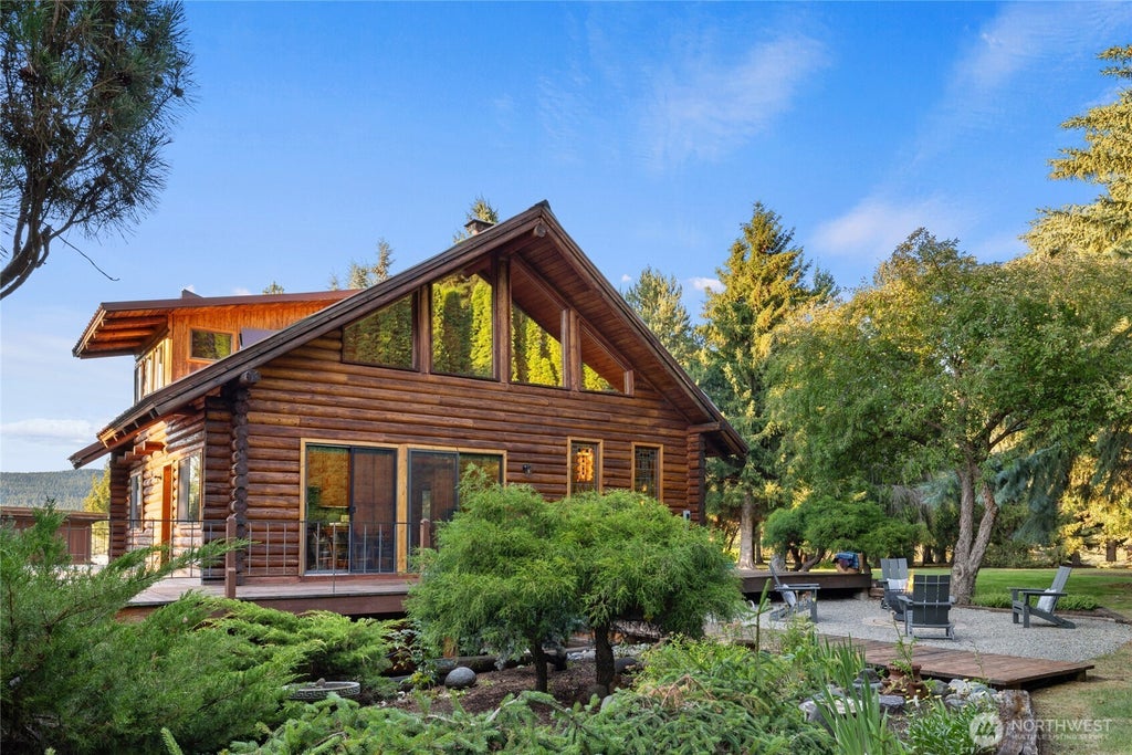Beautiful log home gracefully set on 3.2 serene acres, offers a perfect fusion of rustic charm and contemporary conveniences. With 3 bedrooms, 2 baths, and a versatile bonus room, this property is thoughtfully designed for both everyday living and joyful entertaining. Step inside to be greeted by soaring vaulted ceilings, a cozy wood-burning stove, and unique stained-glass windows that lends a touch of artistic beauty. The property boasts a 2-car attached garage along with a separate 1,050 sq. ft. 3-bay garage with loft storage—plenty of space for all your projects and treasures. Outside, the lush grounds beckon with mature evergreens, maples and fruit trees. Savor the views from the wrap-around porch or find peace relaxing by the pond.