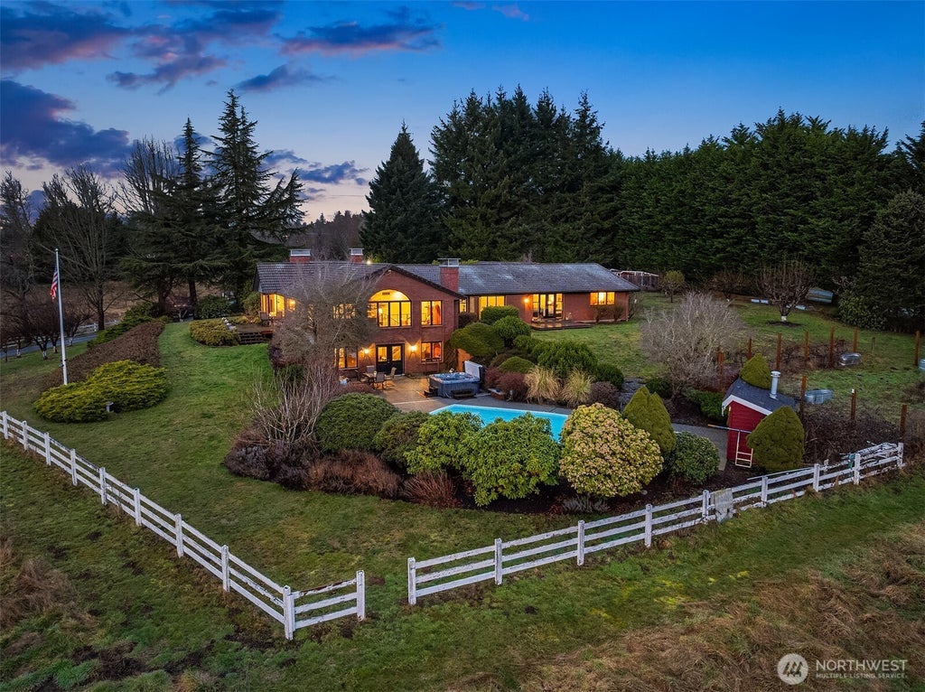 Perched atop Dutch Hill in Snohomish this spacious single-story home sits on 5 breathtaking acres! A 1,400 sqft detached garage offers endless possibilities—workshop, home business or an easy equestrian conversion w loafing shed. Blending modern comforts & vintage charm, this home boasts stunning Western Sunset Views of the Olympic Mt's. Expansive kitchen is designed for entertaining, featuring a large center island & open-concept layout with panoramic views from every window. Primary on Main includes a luxe 5 piece ensuite bath, walk-in closet & walkout to a private deck. 3 separate living areas & a fully finished basement ready for your ideas - possible MIL. Outdoor enthusiasts will love the swimming pool, garden spaces & chicken coop!