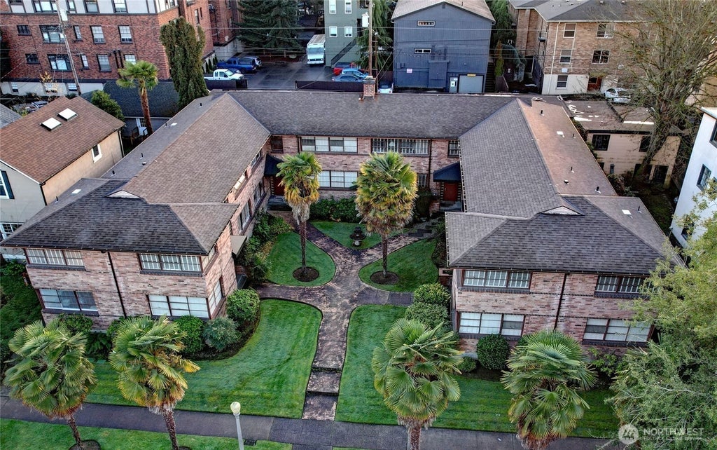 Enjoy NW Spring and Summer! In the Tranquil Private shared garden patio area. Nestled in the heart of Tacoma's vibrant Stadium District, this 1-bed 1-bath condo blends timeless 1950s charm with modern updates. Beautiful Refinished Hardwoods, tilework, updated kitchen & bath, custom shelving unit in LR. HOA dues cover heat (radiators in unit). Property offers serene and secure living with fully fenced grounds. Enjoy the convenience of in-unit WD, additional laundry facilities in basement, Secure/Dry basement storage closet. Off street parking in your Private Garage. Close to restaurants, shops, Ruston Way Waterfront, light rail, and med. facilities, this iconic Condo is ideal for those seeking both style and easy access to amenities and I-5.