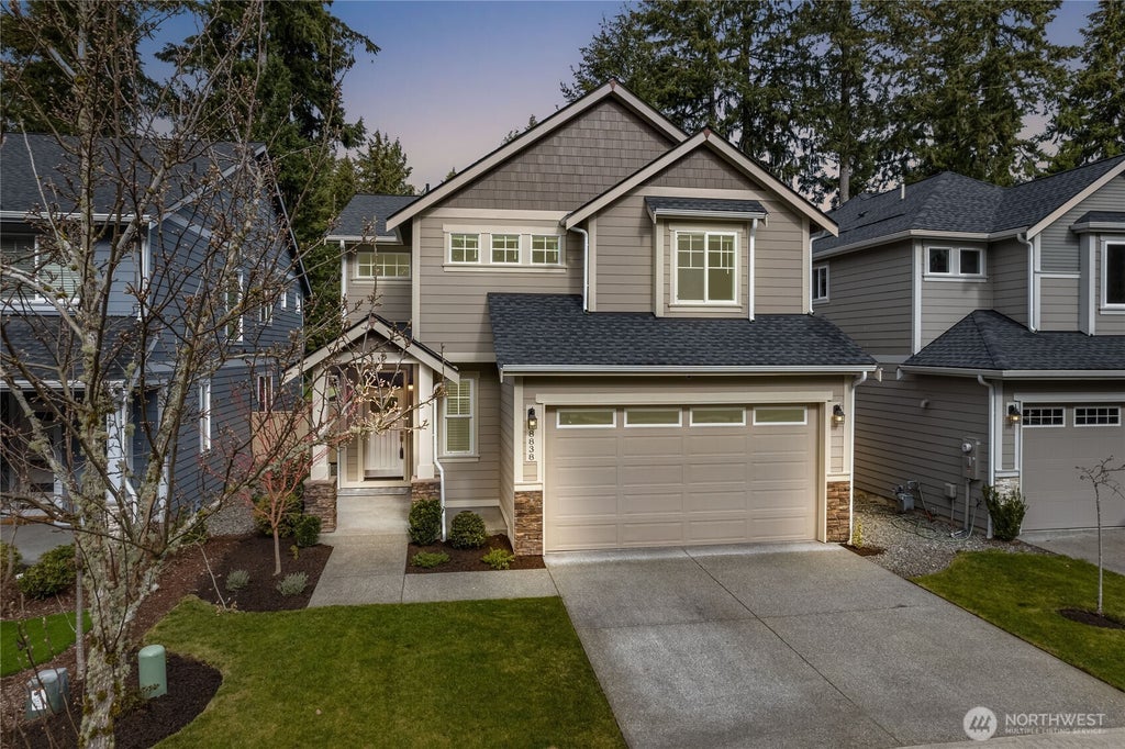 Golf Course Views! This stunning home in Campus Peak by Rob Rice Homes features a spacious 2,385 SF floor plan with 4 bedrooms, a den, a bonus room, and 2.5 baths. The gourmet kitchen has a large center island, quartz countertops, a full tile backsplash, and beech ‘Espresso’ shaker cabinetry, open to the dining and living areas with a gas fireplace. The primary suite offers golf course views, a 5-piece bath, tile floors, and a walk-in closet. Enjoy the large bonus room and outdoor living with covered front and back porches. Views of the 18th fairway!