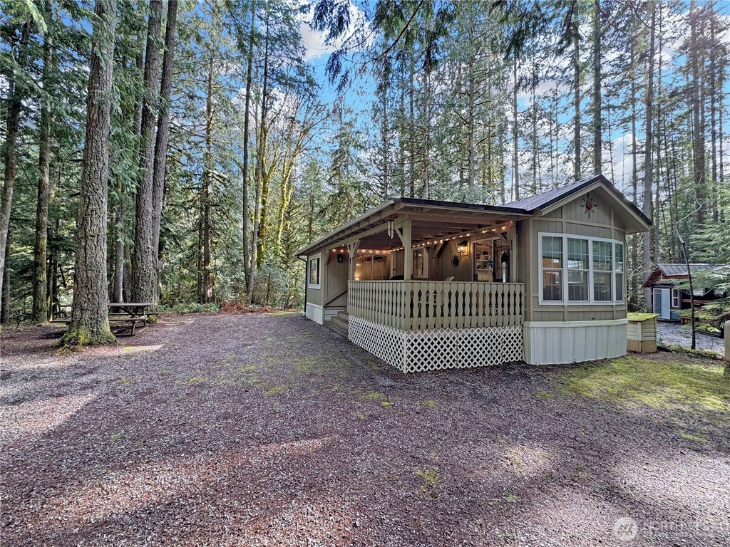 Situated at the end of a quiet cul-de-sac in Division 6, this spectacular pie-shaped lot offers plenty of space for privacy & outdoor enjoyment. Extremely well cared for, it features an add-a-room, a covered deck & vaulted ceilings that fill the space w/ natural light. The bunk room & add-a-room provide extra sleeping space, while the full bath offers convenient access from both the bunk room & the hallway. Complete w/ a shed, woodshed, picnic area & fire pit, this getaway provides a nature retreat w/out sacrificing the comforts of home. Community amenities include pools, hot tub, library, laundromat, clubhouses, tennis, basketball & pickleball courts, 24/7 security, gated entry & playgrounds & more. Zoned 120 days/yr occupancy. No rentals.