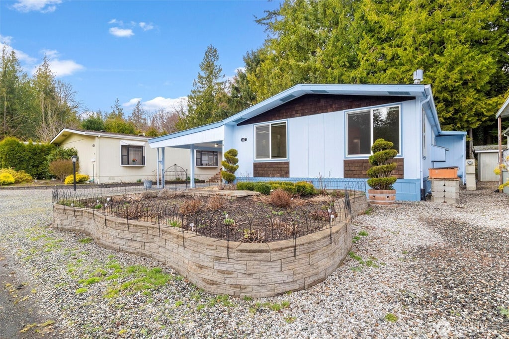 Welcome home to Bellingham's most desirable 55+ community. Premier location in the park, situated for all day sun & gorgeous views overlooking the lake from your living & dining room. Meticulously maintained 2 bed, 1.75 bath w/ spacious floor plan & inviting gas fireplace in the living room. Updated kitchen w/ counters & backsplash, oven, induction cooktop & dishwasher. Newer: Laminate flooring, custom blinds & bathroom countertops. Recently re-leveled foundation & 2 car carport. Countless updates throughout the property. Award winning raised garden bed in front, "catio" front deck, spacious gardeners potting shed, raised beds, custom fully fenced back yard w/ cedar workshop shed w/electricity + swing above terraced paver patio. A Must See!