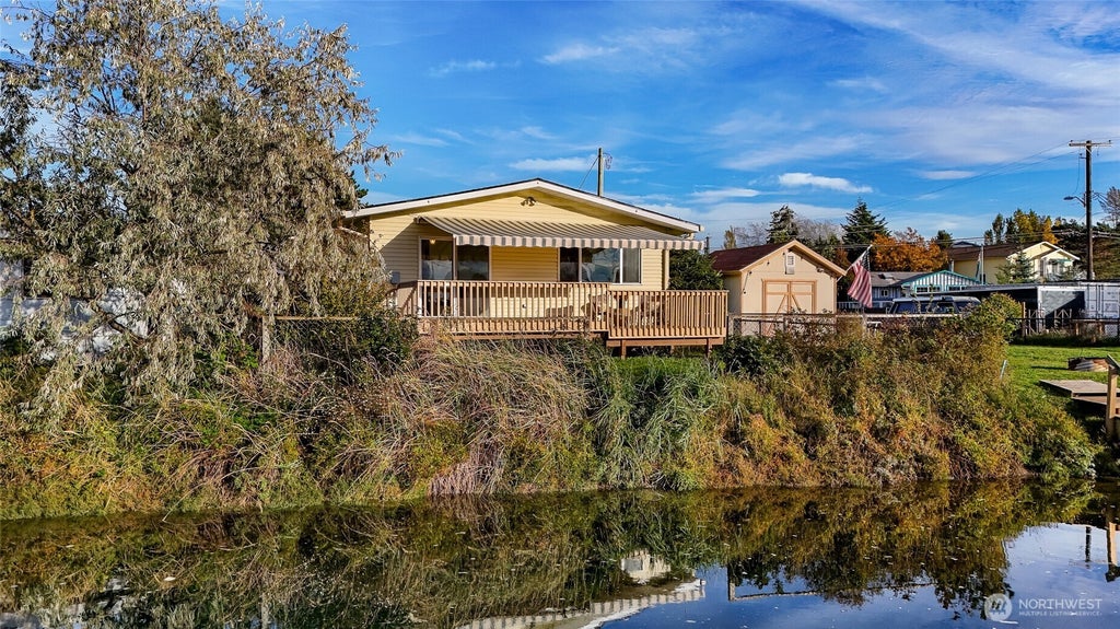 On the banks of Terrill Creek with unbelievable bay sunsets just beyond the creek, this adorable stick-built home is super clean, with fresh paint, updated bathrooms, and new carpet in the bedrooms. Imagine yourself enjoying the views on the big deck with the newer automatic awning spanning the entire length after a day of paddleboarding or kayaking the creek. This home offers AC on a hot day and a cozy fireplace on a winter day, hot tub hookup on deck and large windows in every room to welcome in light. It's hard to find a more idyllic 3-bedroom bayside cottage in Birch Bay at this price. Storage shed for all your outdoor essentials. Experience all that Birch Bay offers: beachcombing, crabbing, restaurants, shops and a waterfront walkway!