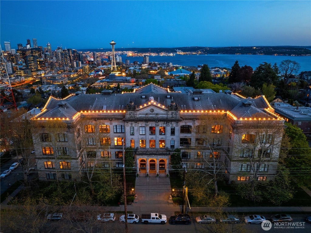 Rare opportunity in historic Queen Anne High School’s coveted Industrial Arts Building! This sophisticated condo offers stunning top-floor views, lofty ceilings, and expansive, light-filled windows. Gather or relax in the spacious living room effortlessly flowing to an open dining area and stylish kitchen beyond. Two generous bedroom suites are tucked upstairs together along with a private terrace…step out for wide open views from North Lake Union to the Space Needle and beyond! Extras include custom closets, main-floor mud/laundry room with full-size washer/dryer duo, and reserved parking in the secure garage. Stroll to parks and Queen Anne Ave’s beloved restaurants & coffee houses. No rental cap means this is a great investment, too!