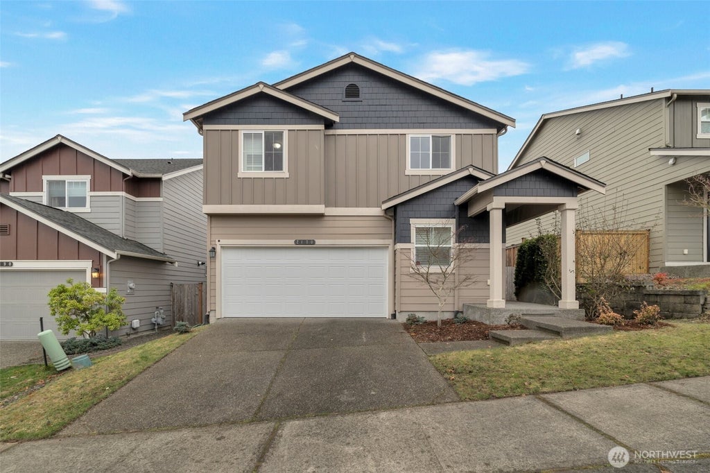 Light and bright Villas at Lakeland Hills craftsman 4 bedroom, 2.5 bath home. Peaceful, quiet neighborhood with community park. Main floor new plank flooring, kitchen with plenty of prep area, walk in pantry, stainless appliances, dining and living room with access to the private fenced, level backyard. Main floor den/office/bedroom. Powder room and access to 2 car garage. Upper floor loft. Laundry. Primary suite with 5-piece bath and walk in closet, three additional bedrooms and full-bath. Conveniently located to walking trails, parks, services, freeway and transit access. New flooring, interior paint, garage door, and appliances!
