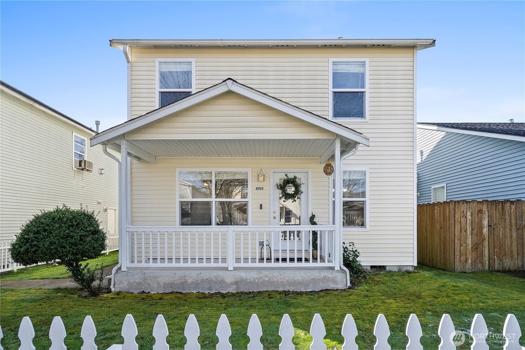 Welcome to College Spring! Fantastic and affordable move in ready home with picket fence, low maintenance yard, and covered front porch. 3 bedroom home with 2.5 baths over 1600 sq Ft. Interior features include large great room with open kitchen, with a half bath downstairs. Walk in pantry provides plenty of storage in the kitchen. Upstairs includes a generous primary bedroom with en-suite bath. Open landing upstairs can be used as an office or play room/utility room. 2 car garage with plenty of room for storage. Newer roof, new carpeting, new Hot Water Heater, and fresh interior paint. Great location near schools, shopping, parks, and restaurants. Easy Access to I-5 and JBLM, and street parking in front or in the driveway using alley access
