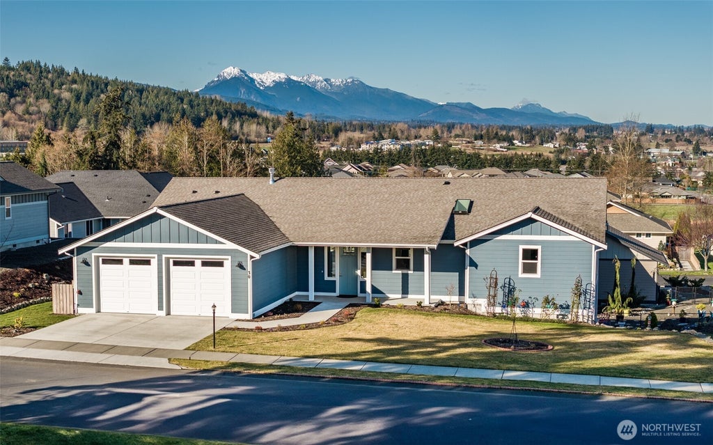 Pristine 2023 contemporary home with 3,100 SF, featuring a STEP-FREE 2,300 SF main level boasting Olympic Mt VIEWS; perfect for entertaining, hobbies, multi-generational living... Open-concept: view-oriented Great Room with fireplace, Dining, 340 SF covered viewing Deck & Gathering Kitchen with loads of Quartz island seating, SS appliances & 2 walk-in Pantries. Grand Primary Suite with ensuite Bath & huge walk-in; situated opposite the large Den (or Bedrm), Powder Room, Laundry & no-steps to Garage. Downstairs, an additional 824 SF: Flex/Family Room, Bedroom & Full Bath. Quality throughout: Quartz, LVP, Motorized Blinds, Heat Pump…Within East Sequim City limits near John Wayne Marina, parks & short walk to Discovery Trail & lavender fields!