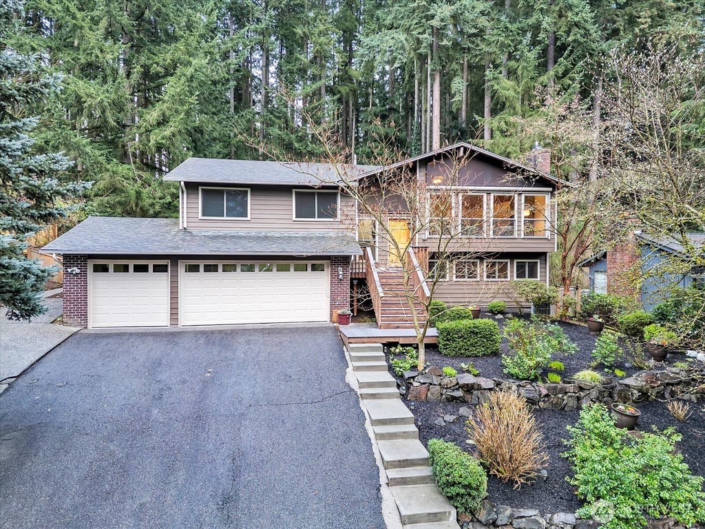 Experience the harmonious blend of indoor and outdoor living in the serene setting of Chestnut Hills! This exquisite home is nestled on a spacious lot, featuring a generous deck that overlooks a breathtaking backyard surrounded by lush greenery. The chef's kitchen is a culinary dream, boasting custom cherry cabinets, stunning granite countertops, and appliances, including a Sub-Zero refrigerator and a NXR stove with a hood. The open floor plan is enhanced by soaring vaulted ceilings, elegant flooring, expansive windows that invite natural light, and cozy gas and wood fireplaces that add warmth and charm. Three-car garage. Award-winning Northshore School District.