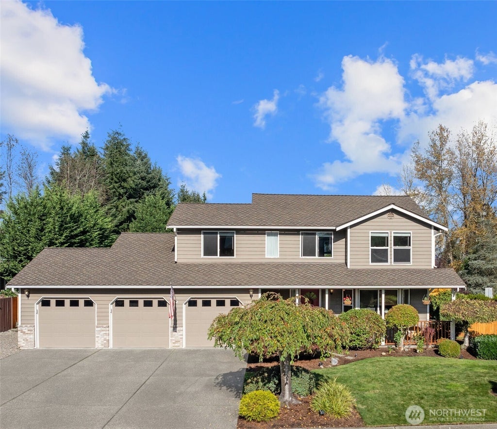 Well-maintained & recently updated home w/a 3-car garage, covered front porch & large, fully-fenced beautifully landscaped yard on a corner lot in The Falls! 2024 updates include windows, kitchen, bathrooms, LVP flooring, 60-year Presidential composition roof (2016) & new porch railing. The level backyard is a peaceful oasis w/Maples, Spruce, Firs, blueberries & huckleberries, storage shed + an impressive “off-grid” outbuilding w/Dutch door, wood-burning stove, insulation, maple walls, bamboo floors, solar panel, inverter & slate patio - currently utilized as an office/music studio. A couple of homes from elementary school & trail to Willis Tucker Park. YMCA, shopping/dining, downtown Snohomish & Mill Creek Town Center nearby as well!