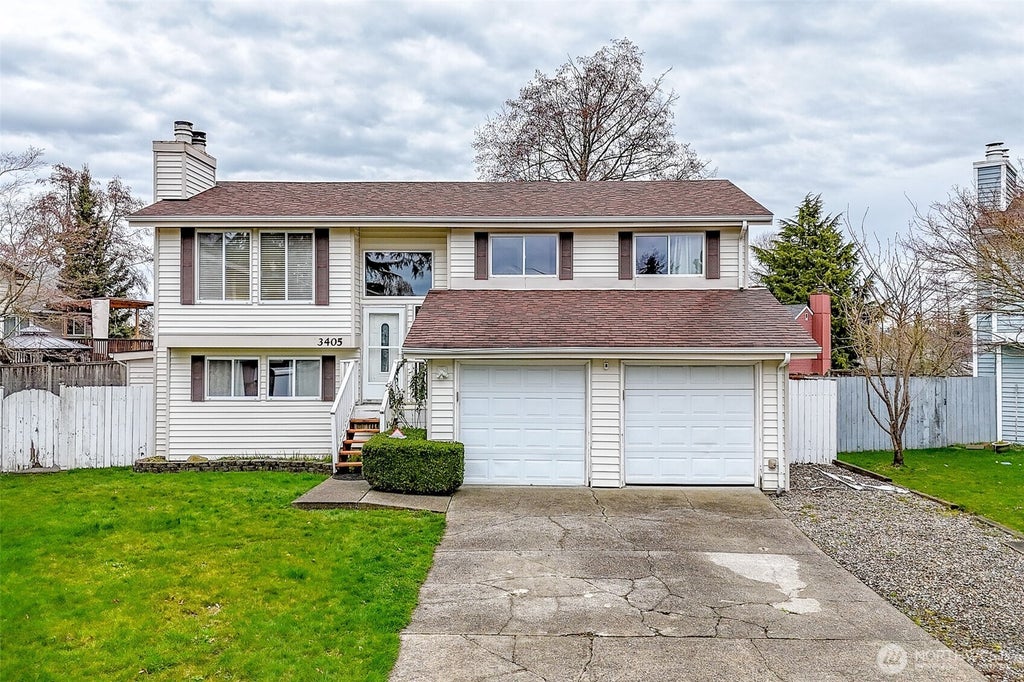 Welcome to this wonderful gem in NE Tacoma! Open concept upgraded kitchen with adjacent dining area. Attached 2-car garage with automatic garage doors. Enjoy two beautiful fireplaces in this home and recent upgrades including laminate flooring, fresh paint, light fixtures, solid wood doors, and water heater. Two primary bedrooms is an additional standout feature of this home. Lower primary suite has new carpet and double closets. En suite full bathroom with granite vanity and new flooring. The second full bathroom has a tiled shower. Great storage throughout. Lovely deck off of upper level overlooking large fenced yard with mountain views of Rainier. Partially covered concrete back patio. Close to local shopping, dining, and schools.