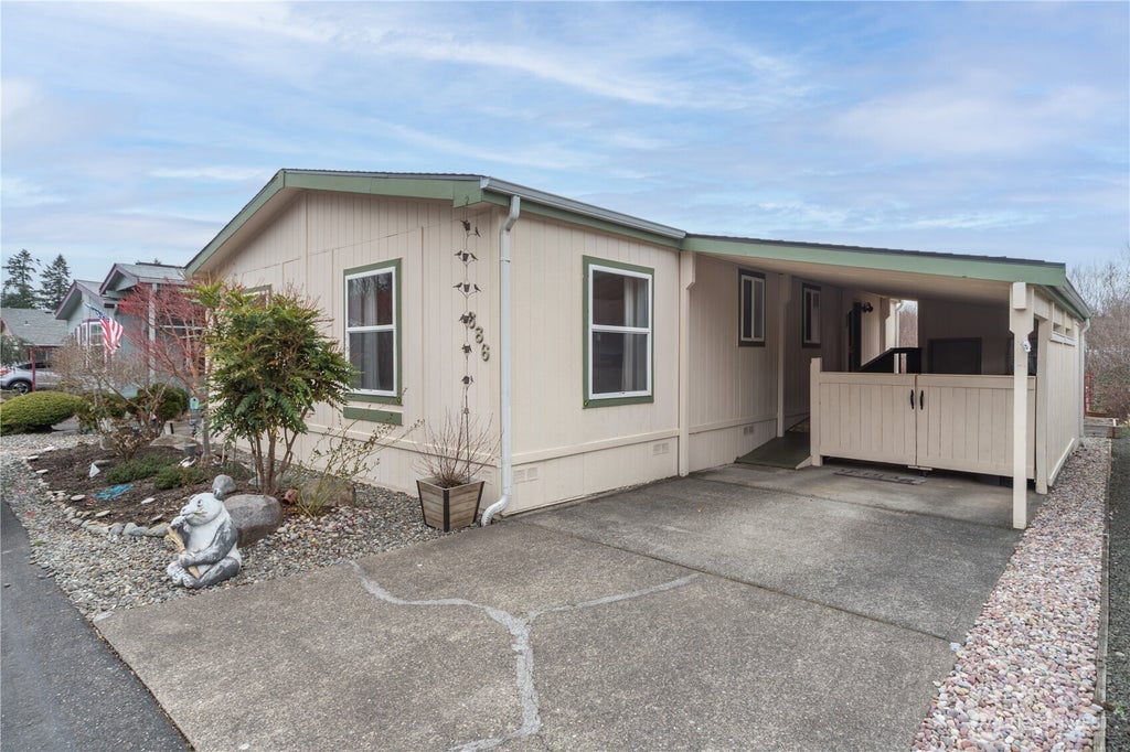 Enjoy Premier Senior Living! Meticulously maintained home features serene yard overlooking pond and wetlands. Spacious updated kitchen features painted cabinets with solid surface counters with breakfast bar and all appliances, nook off kitchen for office or crafts. LVP flooring throughout. The primary bedroom has walk-in closet and bath with walk-in tub. Ramped entry and to back yard. Beautiful, low maintenance, landscaping, composite deck, patio, water feature and raised beds. Quake Safe Foundation. Silverdale Estates is a 55+ community with a clubhouse, indoor swimming pool, hot tub, sauna & more. Close to shopping, restaurants & medical facilities.