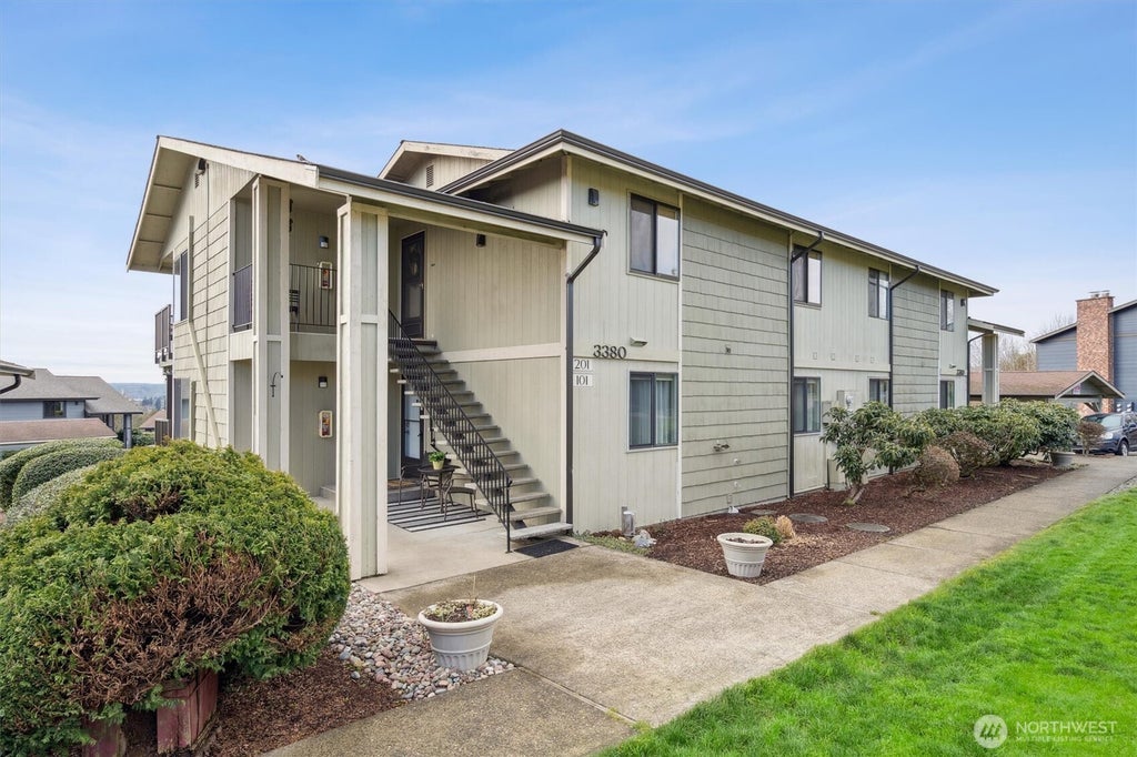 Welcome home to this sought after Sound and Mountain View Condo. Step inside to your spacious living area filled with natural light and a striking electric fireplace, perfect for those chilly evenings. Your well laid out kitchen open to the dining and deck will making hosting a dream. The primary suite features a generous layout & an en-suite bathroom. This ground-floor unit provides easy access, making it ideal for those who prefer to avoid stairs. The unit includes a covered parking space & private storage unit. Community amenities include a sparkling pool & clubhouse, & plenty of open parking. Water, sewer, garbage, earthquake insurance and exterior maintenance are included in HOA dues. Great location near dining, shopping and ferries.