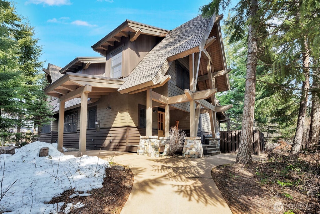 Welcome to an enchanting timber framed home nestled amongst the pines in the private Tumble Creek Community.The serene setting surrounds this high quality home which uses mortise and tenon construction with exposed post & beam,T&G ceiling, all centered on the impressive stone fireplace.The 2,932sqft. home with great room concept & vaulted ceilings is perfect for entertaining & has 4 bedrooms all with their own bathroom & 3 walkin closets.Primary bedroom on main level is accompanied by a delightful kitchen,stainless appliances,bar & walkin pantry with stone & wood accents throughout.Relax on the deck with stone fireplace & mountian views.Ample storage & 2 car detached garage.Close to Club House,pools,tennis,pickleball,paved paths&parks.