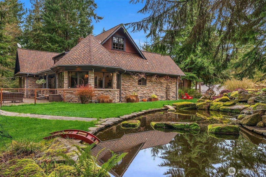 Experience a unique blend of luxury, privacy, and PNW charm in this stunning Craftsman home set on nearly 10 acres. A private drive leads you to this elegant residence, featuring a magnificent floor-to-ceiling stone fireplace that adds warmth to the open-plan great room with soaring ceilings. The chef’s kitchen offers breathtaking views of vibrant gardens & a serene pond w/waterfall. Just across a short covered walkway, you’ll find a nicely designed 1-bdr apartment above a spacious 3-car garage. Many high-end amenities including a versatile freestanding building with a sport court, heated workshop, barn stalls, & equipment storage. The upstairs features a dream space with home theater, game room, sports bar, kitchen & so much more!