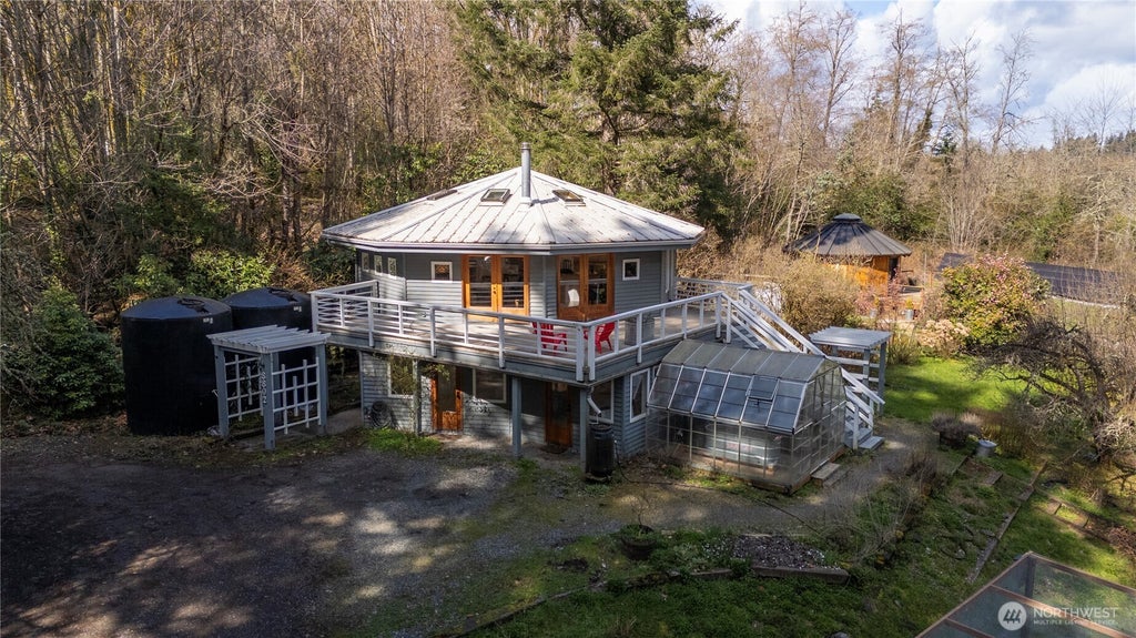 Spectacular NW Contemporary retreat offering the best of Vashon Island only 1/2 mile to town center. Situated on a beautiful & private 1.9 acre lot w/ grid-tied solar panels, local water & potable water catchment system, greenhouse, fruit trees & chicken coop. Grand cathedral ceilings w/ skylights & walls of windows welcome abundant natural light. Open & airy main living area w/ built-ins presents the perfect entertaining space that leads into the large updated kitchen. Ideal reverse floor plan takes full advantage of peek-a-boo Sound views. Three generously-sized bedrooms boasting designer colors & new carpet. Remodeled bathroom w/ heated Terrazzo tile floors. Recently built detached studio w/ wrap-around porch. 1-year new metal roof & A/C