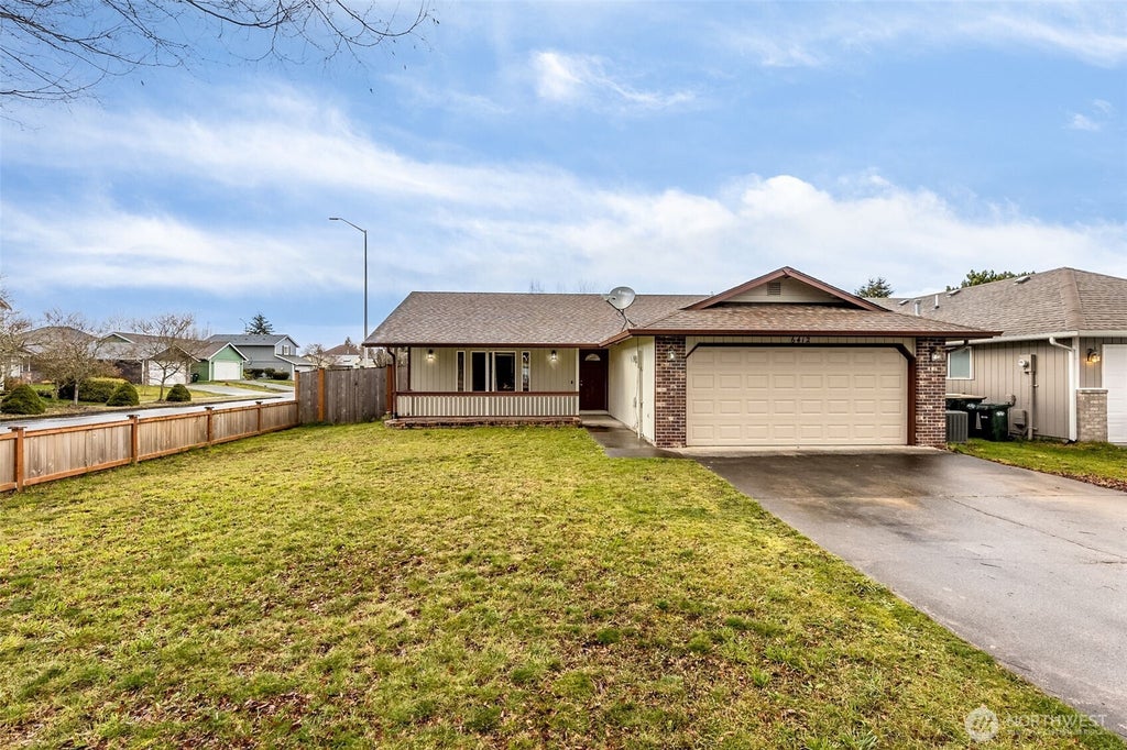 This inviting rambler offers a bright and welcoming atmosphere, ready for you to move in and make it your own. Step onto the charming front covered porch, perfect for enjoying a morning coffee. Inside, vaulted ceilings create an open and airy feel in the living, kitchen, and dining areas. The well-designed kitchen features an eating bar and convenient access to the fenced backyard with a patio—ideal for outdoor gatherings. Stay comfortable year-round with air conditioning. Primary bedroom w/ ¾ en-suite bath and walk-in closet, two guest bedrooms & a full guest bath. Convenient two-car garage. Situated on a desirable corner lot near Thornbury Park, this home is close to shopping, dining, and is easy access to I-5 & JBLM!