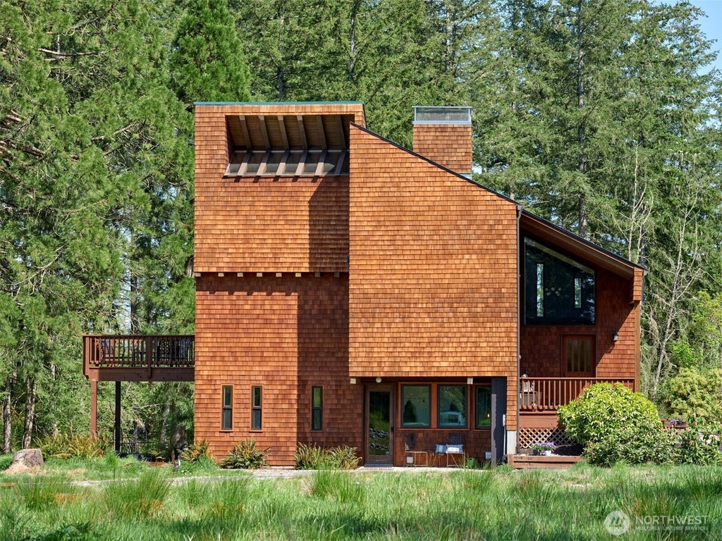 Set against a dreamscape of woods & meadow, this architectural masterpiece showcases art & function on a rural landscape. Exceptional design; every room is unique & purposeful!Spacious kitchen featuring abundance of counter space, modern-style oak cabs, expansive island/work-space & newer SS appls, that opens to living/dining rm. Spacious suite-like beds on each lvl. 3rd Bed is dual purpose as a studio. Exposed beams, vltd ceilings, tongue & groove paneling, fireplaces in sitting rms add to the spellbound affect. Updated w/new roof, furnace, windows & deck+more. 5G fiber internet. 30' x 50' oversized 3 car det. garage+30'x 40' + 27' x 60' shop located on sep. driveway from house. A showpiece at an incredible price!