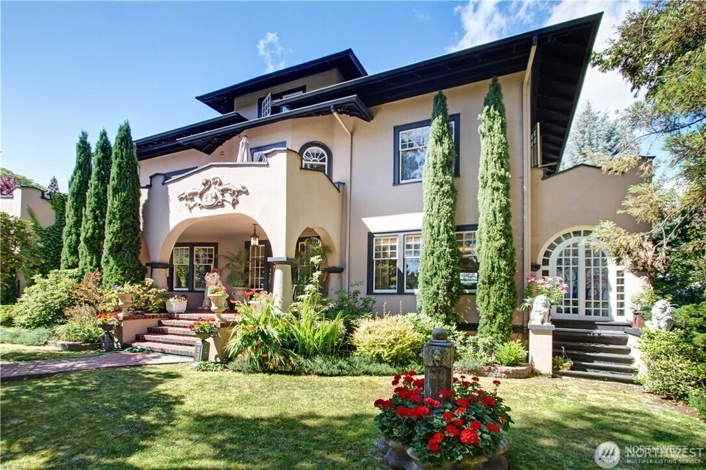 Perched on a 11,000-sf lot, with views of Portage Bay and the Cascades, this 1909 5-bedroom 4-bath iconic Denny-Gates-Bass Mansion designed by architect Elmer Ellsworth Green features formal spaces that blend beautifully. Box beam ceilings, crown moldings, mullioned windows, oak hardwood floors with ribboned inlay. Plus, a solarium and indoor lap-pool. Located near the heart of the city and the U of W.