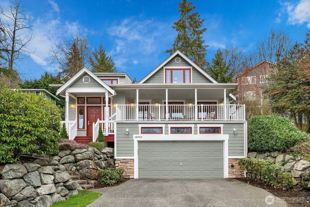 NEW UPDATES as of Feb 2025 Beautifully updated 2,350 sqft home blends timeless charm with modern comforts. A covered porch and an expansive 1,000 sq. ft. wraparound deck set the stage for indoor-outdoor living. Restored original fir hardwoods add warmth and new floors in kitchen. The main floor features a media room, guest bedroom, full bath, formal dining, and a cozy living space with a gas fireplace and porch access. Upstairs, find two spacious bedrooms, a primary suite with a walk-in closet and private deck, plus a generous loft—perfect for a play area and/or home office. Additional highlights include a 2-car garage with electric car charger and a 264-bottle wine storage. Enjoy central A/C, no HOA, and award-winning Northshore schools!