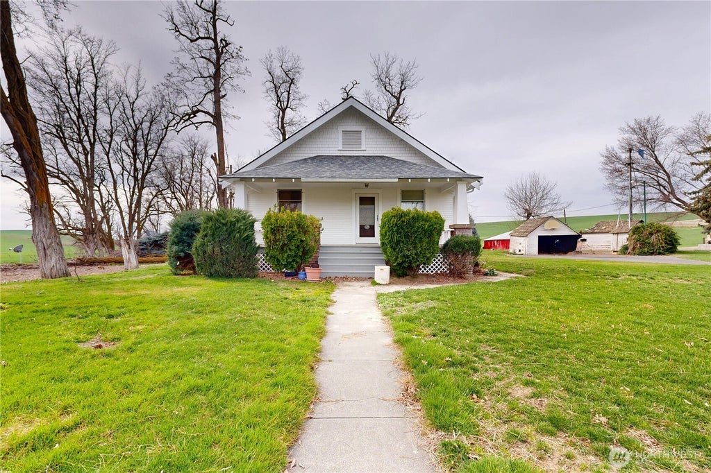 A rare farmhouse nestled among rolling wheat fields, offering a peaceful country setting. You'll love the oversized covered front porch, perfect for enjoying the scenic views and future porch swing. Conveniently located less than 15 minutes from downtown Walla Walla. The full basement presents excellent potential for future finishing to suit your needs. The spacious kitchen is filled with natural light and ample storage. Hardwood floors add warmth and character to the main level. Recent updates include a newer roof & fresh exterior paint. The interior is a blank canvas, ready for your personal touch. All offers are subject to the Buyer and Seller establishing property lines and completing a Boundary Line Adjustment for a 1-acre parcel.